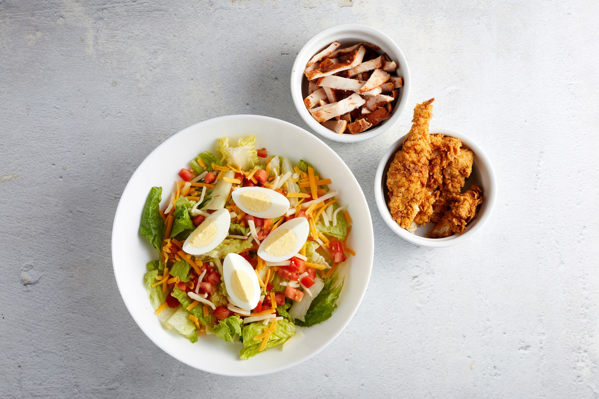 Your Choice of smoked chicken or fried shrimp on top of chopped Romain lettuce, Cheddar & Monterey Jack Cheese, Diced Tomatoes & Crazy Cajun Dressing